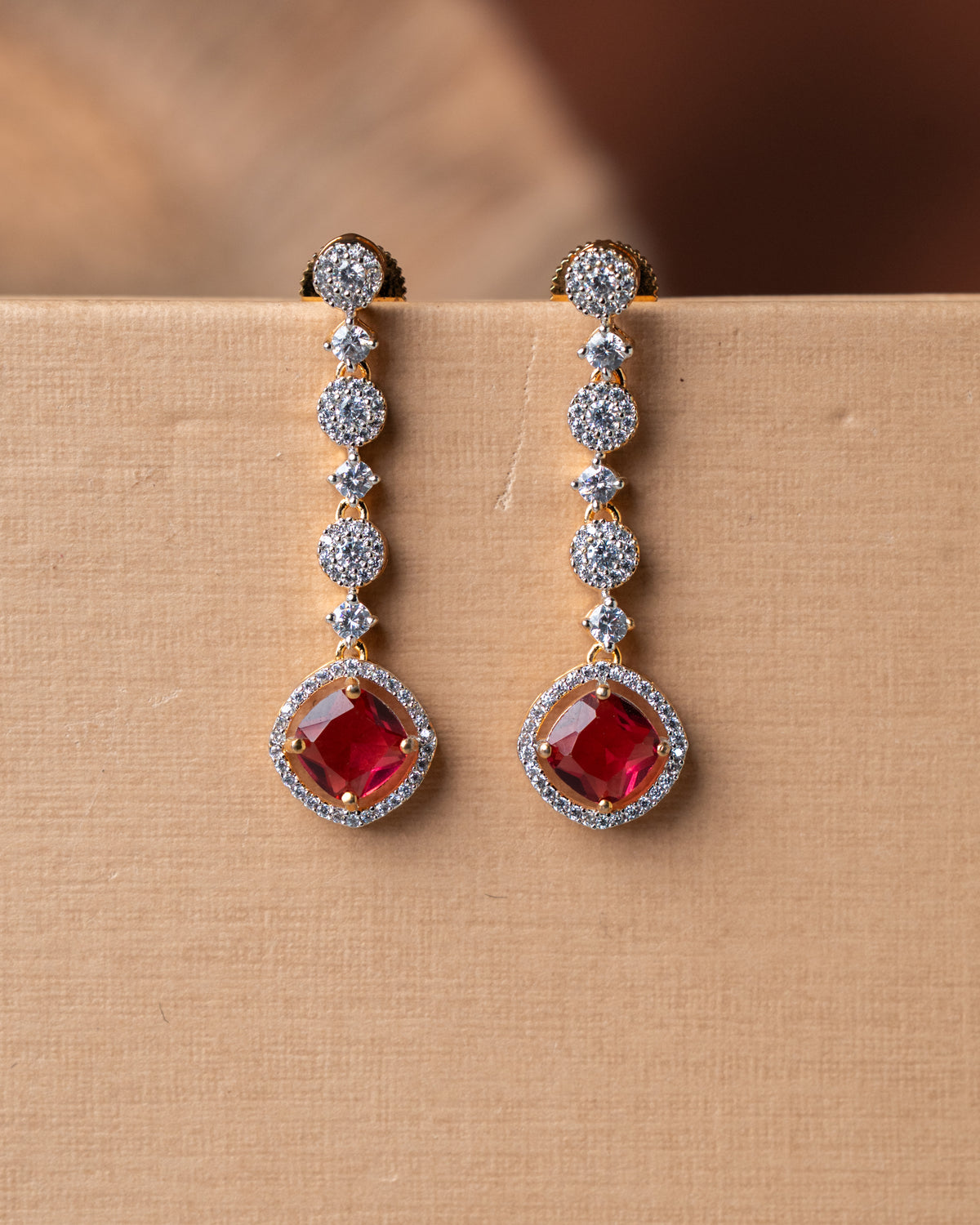 This elegant Gold-Toned AD Solitaire Set offers classic glamour, centered on a brilliant, cushion-cut solitaire pendant surrounded by a sparkling halo. The refined chain is formed by clusters of shimmering American Diamonds (AD) for continuous sparkle. Choose the Clear Solitaire for a timeless, diamond-like glow, or the Vibrant Ruby (or other color) for a rich pop of color. Complete with matching drop earrings, this set ensures a luxurious, sophisticated look perfect for weddings, anniversaries, and any special occasion.