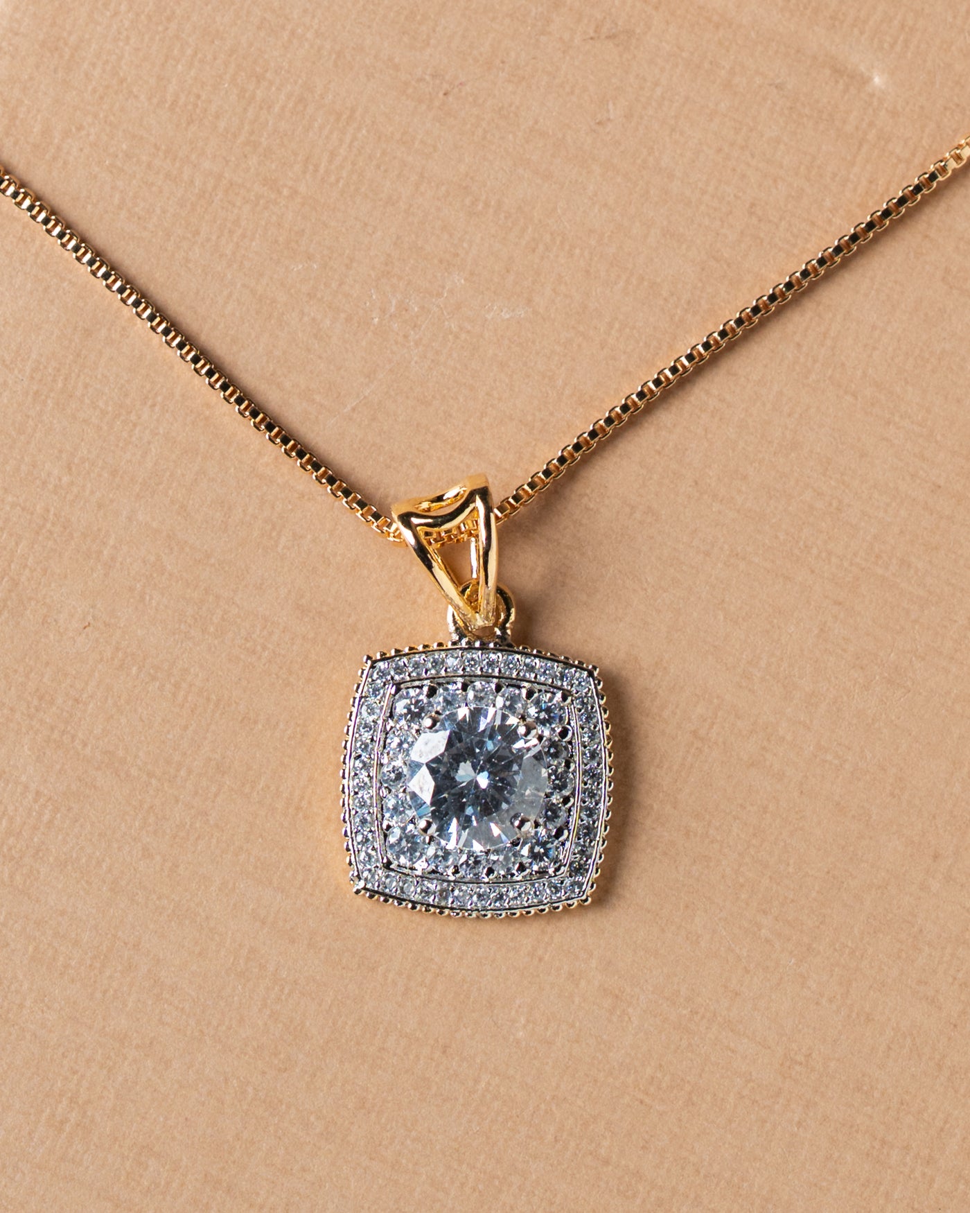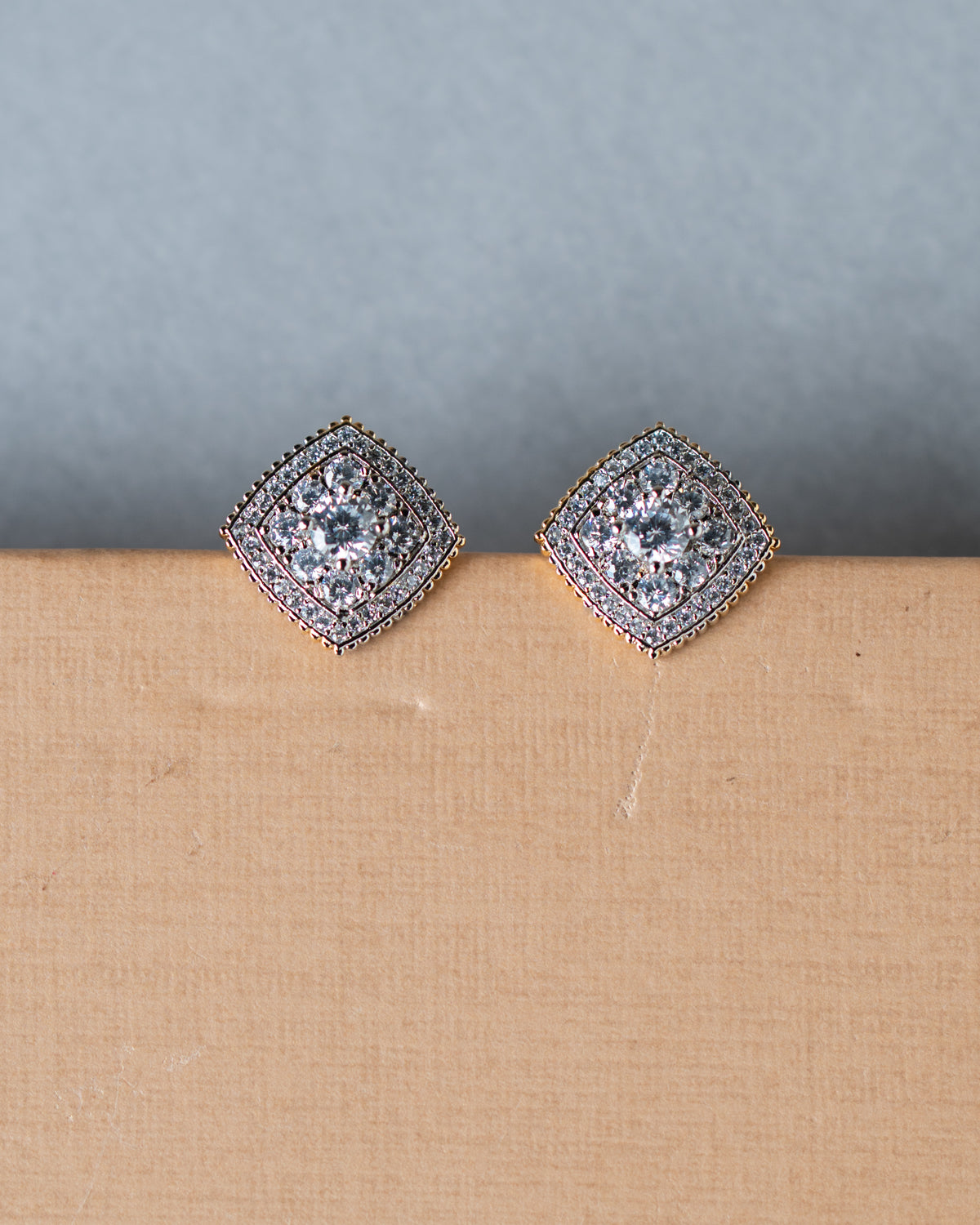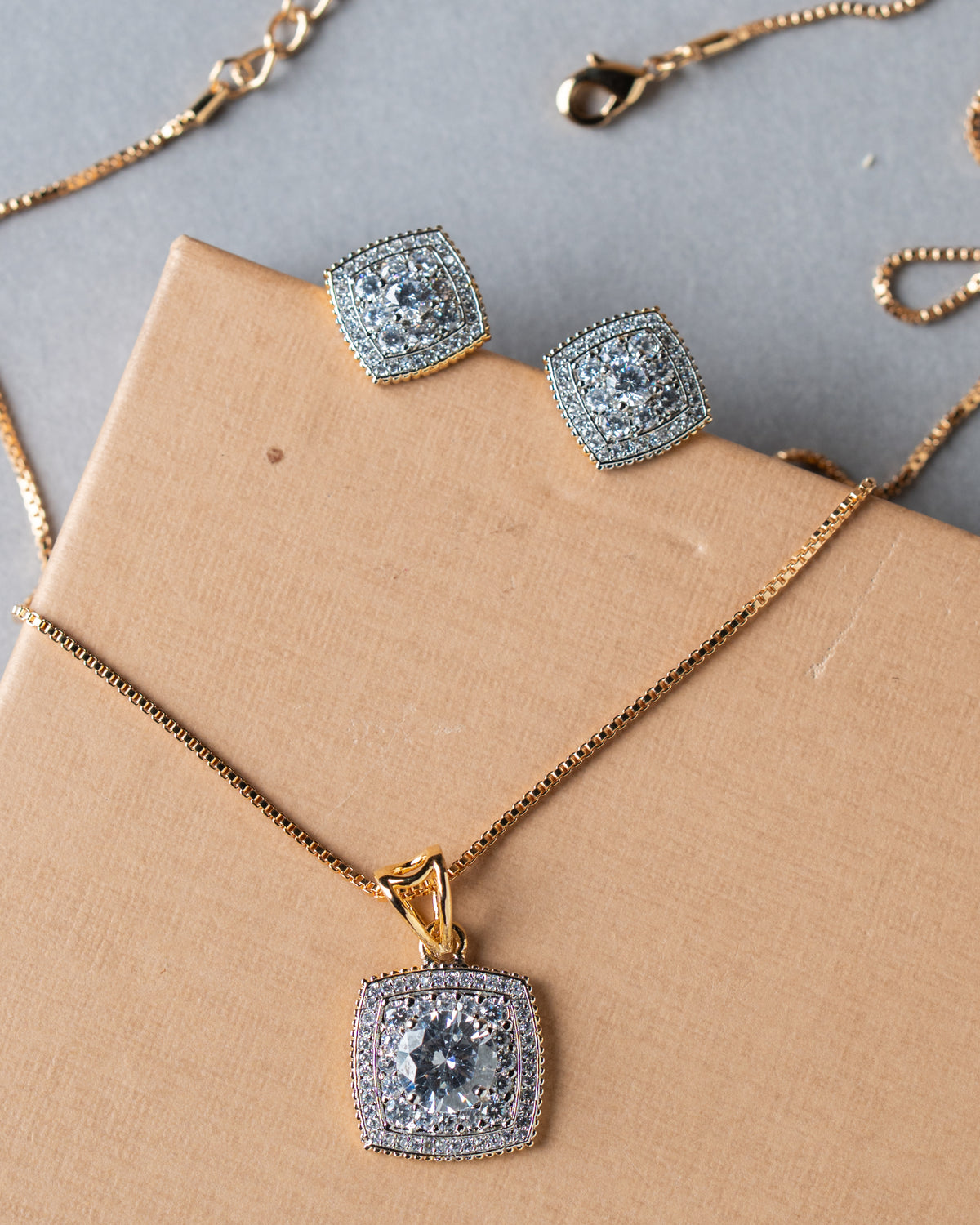 This charming Gold-Toned AD Halo Solitaire Set offers sophisticated sparkle in a wearable size. The pendant features a brilliant cushion-cut American Diamond (AD) surrounded by a shimmering micro-pave halo. The accompanying stud earrings perfectly mirror this detailed design. This elegant set is ideal for everyday wear or as a thoughtful gift, offering the luxurious look of a diamond solitaire. (Note: The chain is for display only and is sold separately.) Courier charges will be calculated according to your Pincode at checkout.