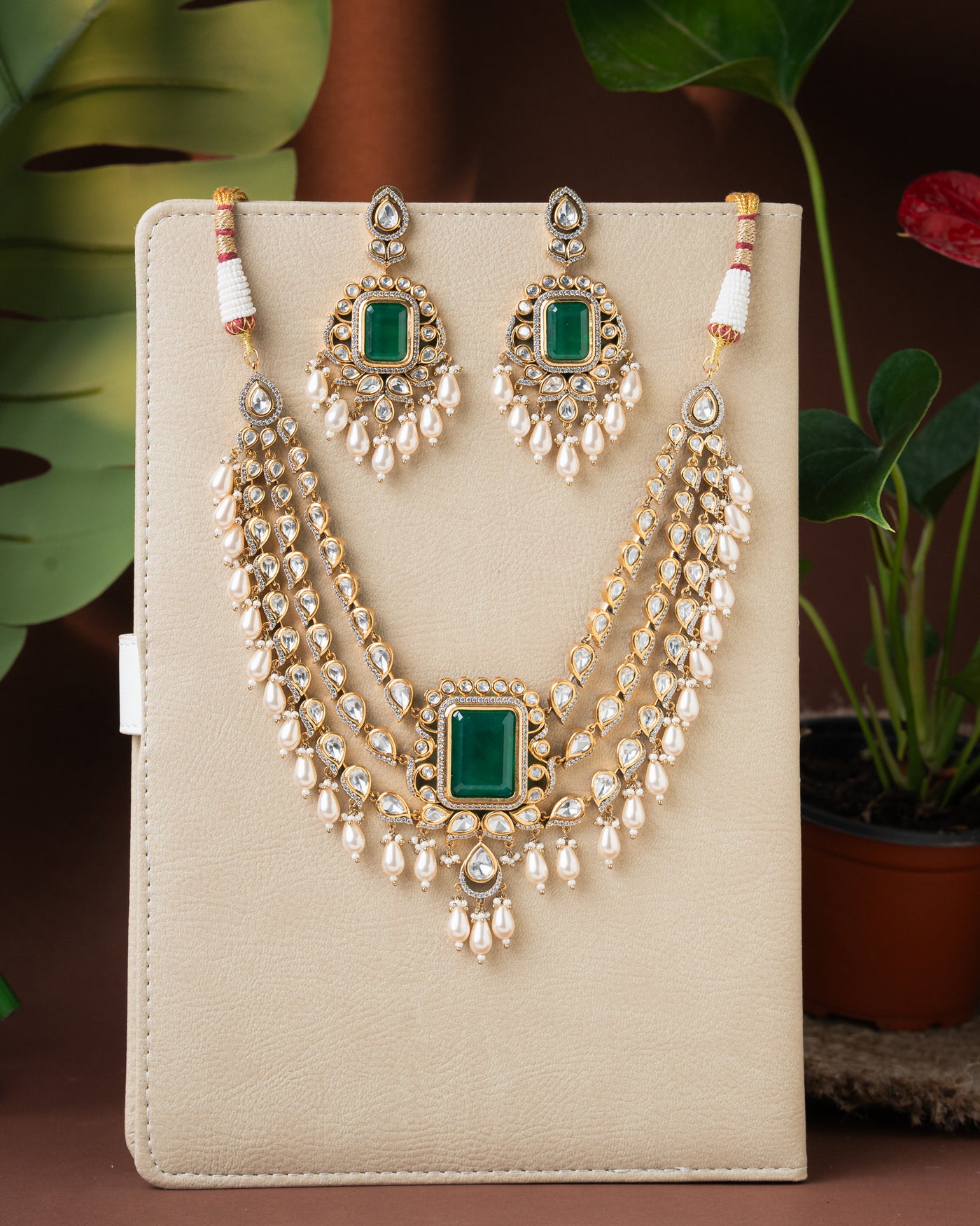 The design highlights a bold emerald green doublet stone at the centre, framed with teardrop kundan stones and fine zircon detailing that adds a subtle diamond like shimmer.