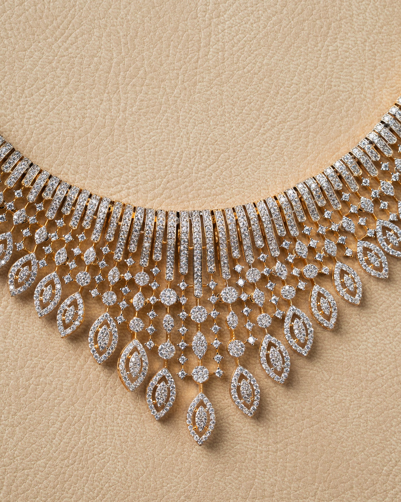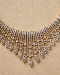 Elevate your elegance with the Radiant Diamond Choker Set from Kanha Art Jewellery. Featuring a breathtaking necklace and matching earrings, this set is intricately designed with shimmering diamond-like stones on a golden base. Its cascading pattern radiates luxury, making it a perfect choice for weddings, parties, and grand celebrations. A blend of modern glamour and timeless charm, this jewellery set is crafted to make every moment unforgettable.