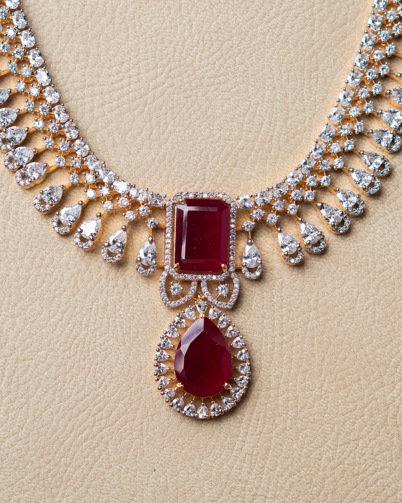 Bring timeless elegance to your style with this Zircon with Ruby Necklace Set, crafted with perfection and premium finish. Designed for women who love luxury with a touch of tradition, this piece sparkles beautifully with high-quality Zircon stones and rich Ruby accents on a gold-tone base.
